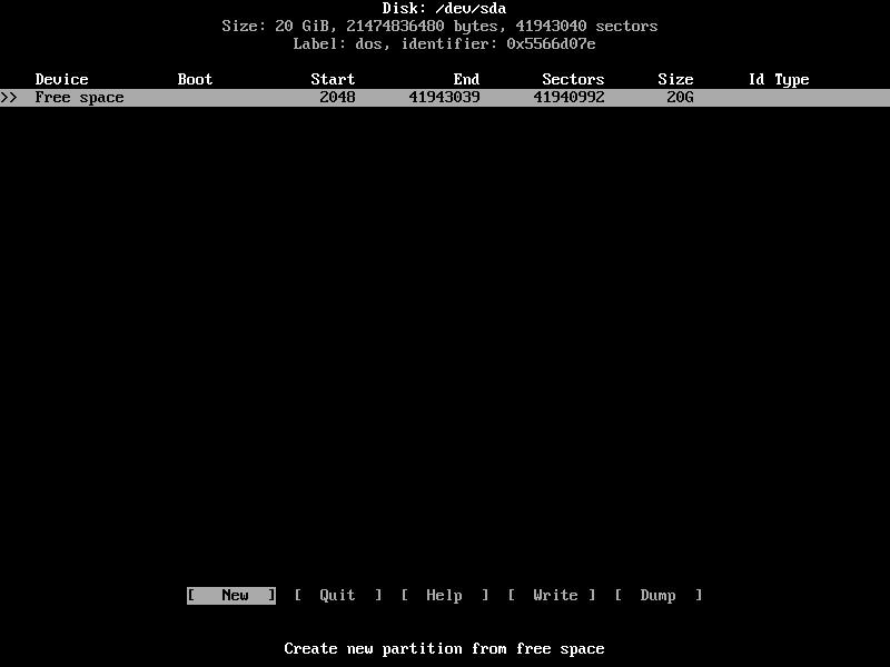 4.下一個(gè)屏幕顯示您在所選磁盤上有多少可用空間并讓您分配它。選擇屏幕底部的New并按Enter開始創(chuàng)建新的磁盤分區(qū)。